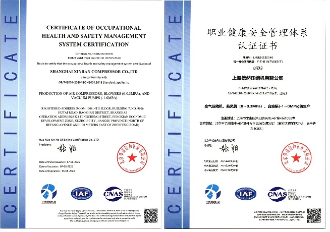 - 信然壓縮機職業(yè)健康安全管理體系(ISO45001)早期表述為OHSAS 18001,現(xiàn)多以ISO 45001為替代標準,聚焦生產(chǎn)過程中的事故預(yù)防與員工健康保護,體現(xiàn)企業(yè)對員工的責(zé)任。