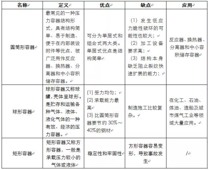 但是方形容器有個優(yōu)點,它具有充分的穩(wěn)定性和牢固性,適合于貯存或運輸很敏感的粉末材料。以上就是幾種比較常出現(xiàn)的壓力容器形狀,壓力容器的用途極為廣泛,它在工業(yè)、民用、軍工等具有重要的作用。在化學工業(yè)與石油化學工業(yè)中用最多,比如這個空氣壓縮機。各類專用壓縮機及制冷壓縮機的輔機,像冷卻器、緩沖器、油水分離器、貯氣罐、蒸發(fā)器、液體冷陳劑貯罐等,這些都是屬于壓力容器。用表格給大家總結(jié)出來這幾類容器的優(yōu)缺點,方便大家收藏記憶!!