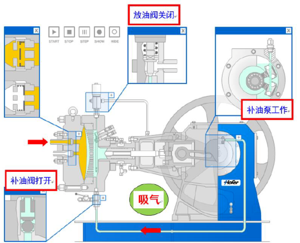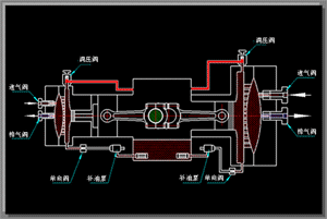 在壓縮機(jī)的每個(gè)循環(huán)中,液壓油推動(dòng)膜片壓向氣盤(pán)。如果泄露的潤(rùn)滑油得不到及時(shí)的補(bǔ)充,潤(rùn)滑油容積將不但下降,膜片會(huì)不能貼近氣盤(pán),導(dǎo)致余隙容積增大,影響壓縮機(jī)的性能。因此正確的補(bǔ)償油路系統(tǒng)是保障壓縮機(jī)性能的一個(gè)關(guān)鍵。
