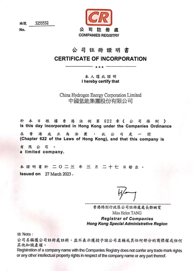 China Hydrogen Energy Corporation Limited 中國(guó)氫能集團(tuán)股份有限公司由香港特別行政區(qū)公司注冊(cè)處處長(zhǎng)審批注冊(cè)證明書。China Hydrogen Energy Corporation Limited 中國(guó)氫能集團(tuán)股份有限公司是國(guó)際化、集團(tuán)化、央企化的大型氫能設(shè)備和氫能源開采和供應(yīng)商,承包大型國(guó)內(nèi)、國(guó)際氫能項(xiàng)目建設(shè)。是專業(yè)的生產(chǎn)商、運(yùn)營(yíng)商、服務(wù)商。