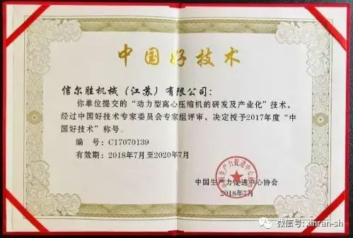 信然空壓機(江蘇)工廠生產的信然牌離心式壓縮機榮獲“中國好技術”稱號到今天為止,信然壓縮機公司已經累積交付離心式壓縮機數(shù)百臺,信爾勝機械(江蘇)有限公司提交的“動力型離心式壓縮機的研發(fā)及產業(yè)化技術”經中國好技術專家委員會專家組評審,被中國生產力促進中心協(xié)會授予“中國好技術”稱號!