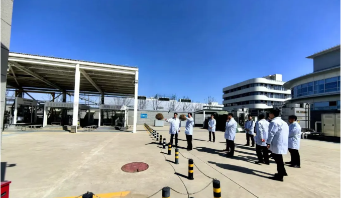 在集團(tuán)講解人員的引領(lǐng)下,先后參觀了大興氫能展廳、加氫站內(nèi)氫能汽車加氫、加氫站整體規(guī)劃布局、儲(chǔ)氫、壓縮氫及氫氣壓縮機(jī)轉(zhuǎn)運(yùn)工作實(shí)況。同時(shí)還參觀了燃料電池展廳、電解槽及組裝生產(chǎn)車間。